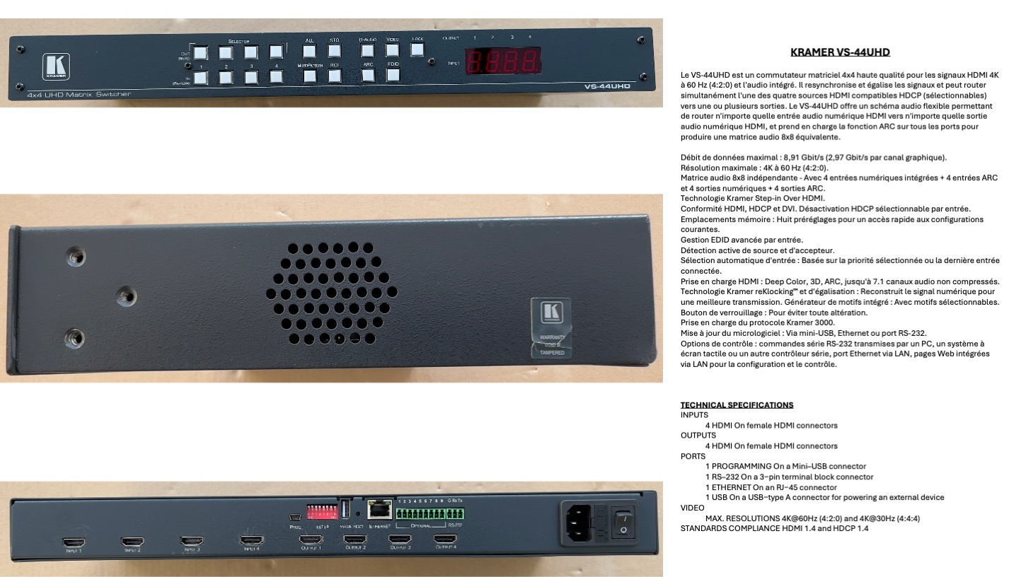 Le VS-44UHD est un commutateur matriciel 4×4 haute qualité pour les signaux HDMI 4K à 60 Hz (4:2:0) et l’audio intégré. Il resynchronise et égalise les signaux et peut router simultanément quatre sources HDMI compatibles HDCP (sélectionnables) vers une ou plusieurs sorties.