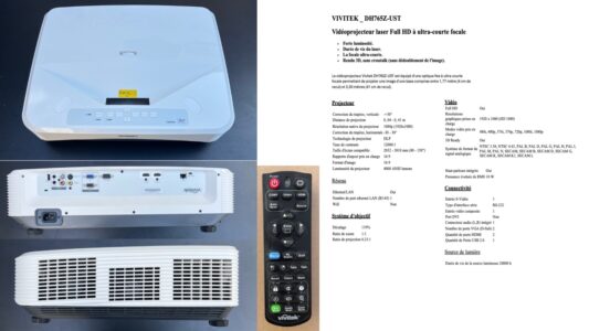 Ultra-courte focale avec une taille d’écran jusqu’à 150 pouces et une résolution Full HD 1080p.